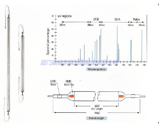 UV燈為氣體放電燈,氣體放電燈分為弧光放電和輝光放電,UV固化中常用UV燈為弧光放電燈,其工作原理是:在真空的石英管中加入定量的高純汞(水銀),通過對兩端電極提供電壓差(壓降),產(chǎn)生離子放電,從而產(chǎn)生紫外線輻射。UV燈的功率要滿足要求(一般為8 0—120W/cm);UV燈的最大壽命不能超過1 200h,一般建議使用1 000h;UV燈使用500h換一次,保養(yǎng)一段時間兩支UV燈使用時可交替使用,一支為使用500h,另一支為使用500一l 000h之間的燈管;燈管清洗并逆時針旋轉(zhuǎn)1/4周后再使用。
